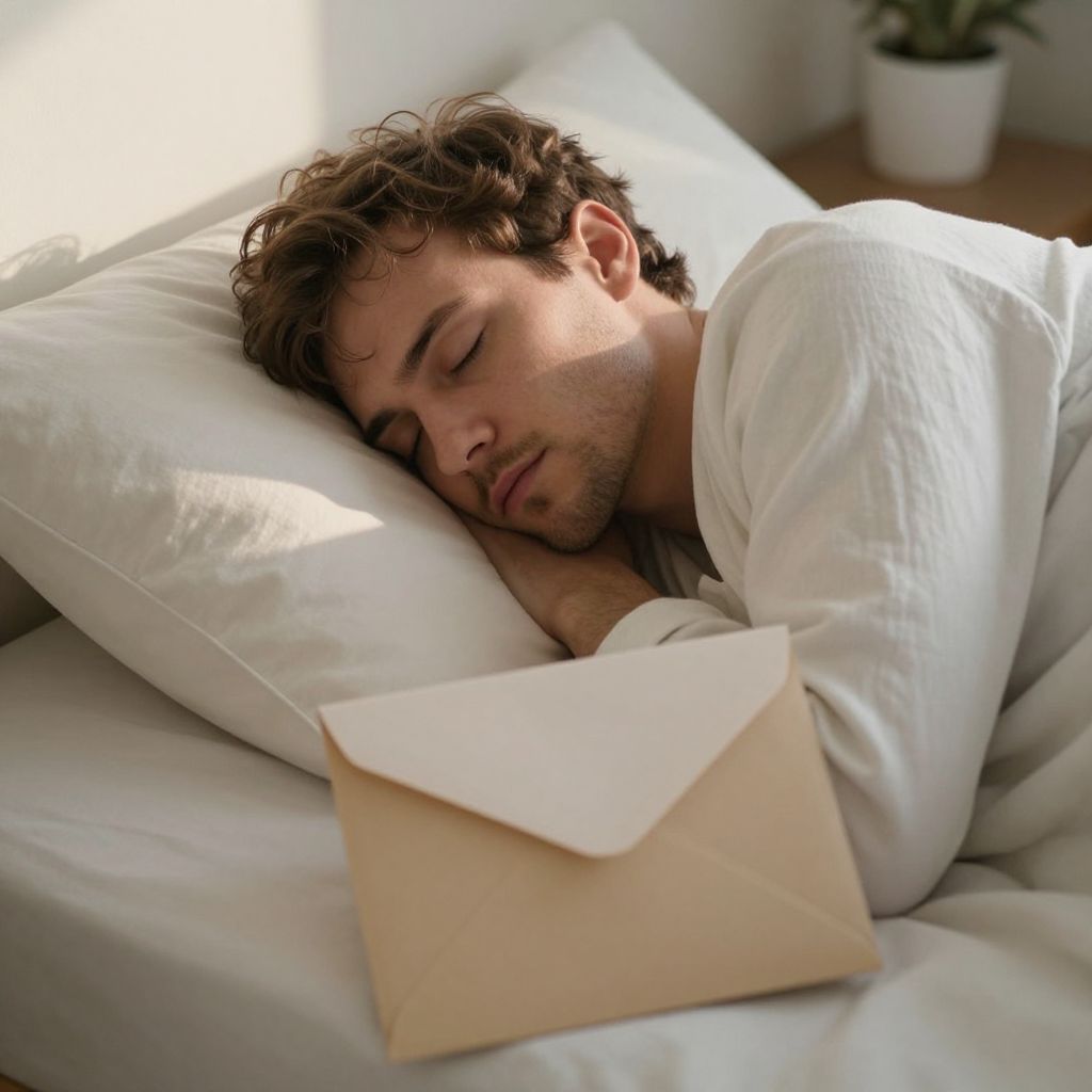 Photograph of a young white man with curly brown hair and a light beard, sleeping on a white pillow and bed with white sheets. He wears a white, long-sleeved shirt and rests his head on his right arm. In the foreground, a light brown, sealed envelope with a white flap is placed on the bed near his hand. Soft sunlight filters in from the left, casting gentle shadows. In the blurred background, a small potted plant sits on a wooden nightstand. The overall scene is serene and intimate.