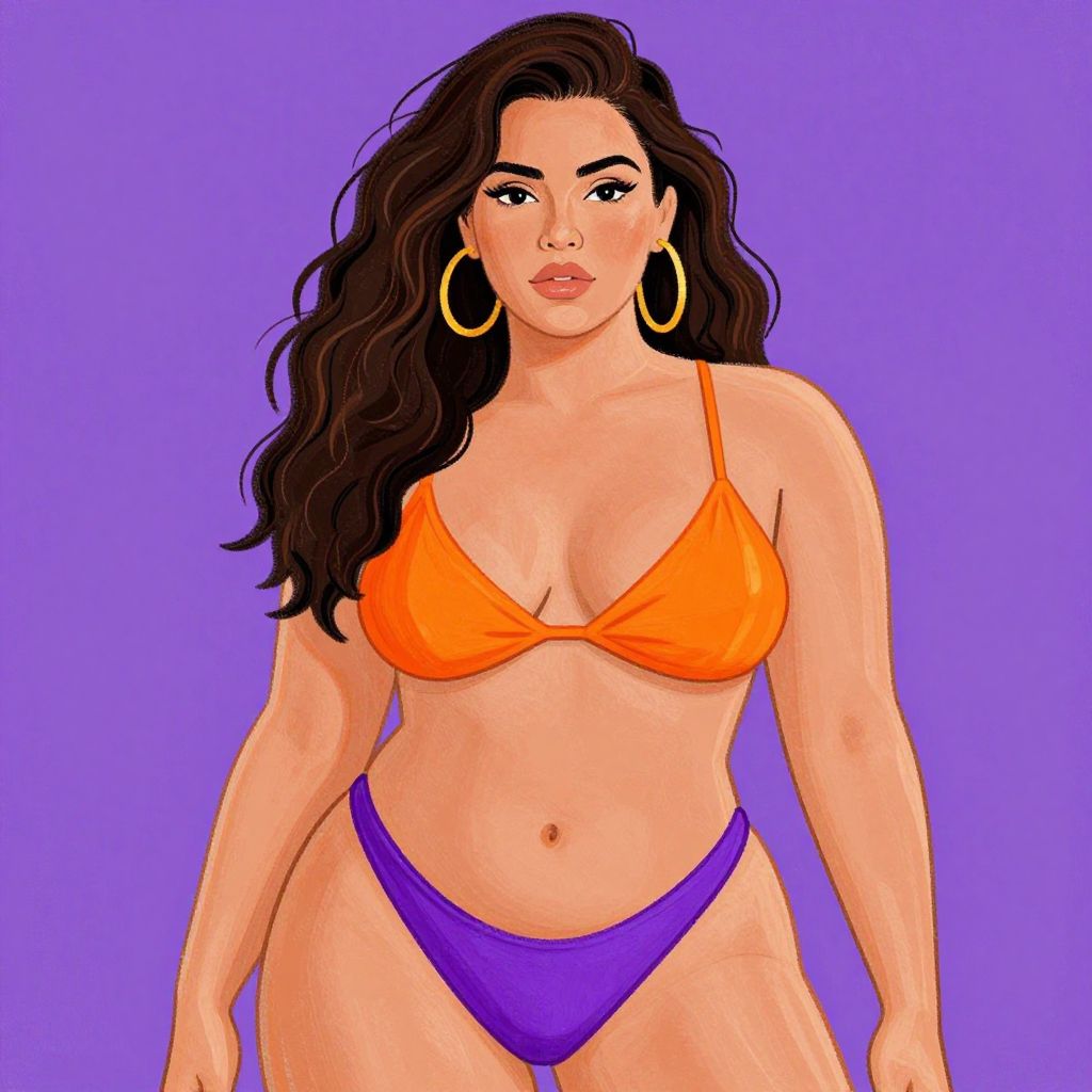 A digital illustration of a curvy woman with long, wavy dark brown hair, wearing a bright orange bikini top and purple bikini bottoms. She has large gold hoop earrings, full lips, and a confident expression. Her skin is light brown, and she stands against a solid purple background. The illustration style is vibrant and cartoonish, with bold lines and bright colors, highlighting her hourglass figure and confident stance.