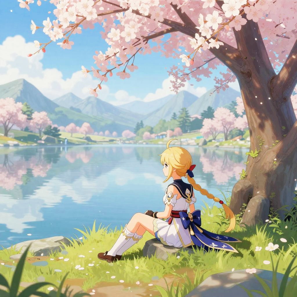 This digital anime-style illustration depicts a young girl with green hair and a braid, sitting on a grassy rock by a tranquil, sunlit pond. She wears a white, loose-fitting t-shirt and green shorts. Her profile faces left, showcasing her calm expression. The background features lush, green trees and bushes, with sunlight filtering through, casting dappled shadows on the water and rocks. White flowers dot the grassy area, adding to the serene, natural setting. The water reflects the greenery, enhancing the peaceful atmosphere.