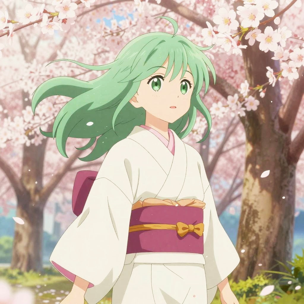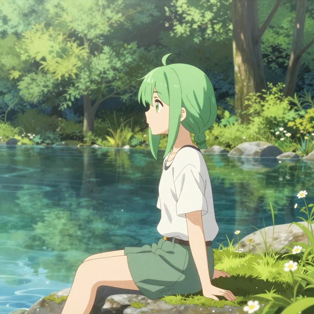Anime with green hair girl sitting by a crystal clear lake surrounded by lush forest, soft sunlight filtering through trees, peaceful and serene mood, delicate shading on hair and clothes, wearing casual modern dress, high detail nature background with wildflowers