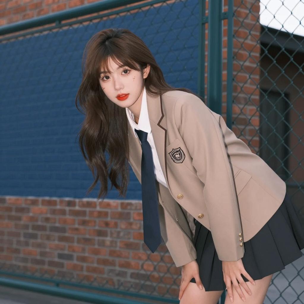 Portrait of an Asian young woman with long black hair wearing a navy blue school blazer with gold buttons, a white shirt, red plaid skirt, and a striped bow tie. She is leaning forward with her right hand touching her head, set against a background of a green and yellow train. The subject has an intense gaze and slightly parted red lips.