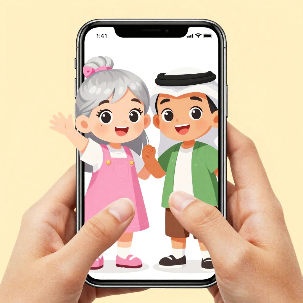 Two best friends, 7-year-old Pacific Islander boy and 11-year-old platinum blond-haired girl, happy, styled as children's book illustration, in front of a smartphone, vibrant and joyful