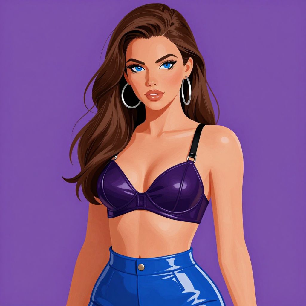 Digital illustration of a beautiful woman with long brown hair, fair skin, and piercing blue eyes. She's wearing a dark purple leather bralette with black straps and high-waisted, shiny blue vinyl shorts. Large silver hoop earrings adorn her ears. She's standing against a solid purple background, looking directly at the viewer with a confident expression. The art style is bold and colorful, with clean lines and vibrant hues.