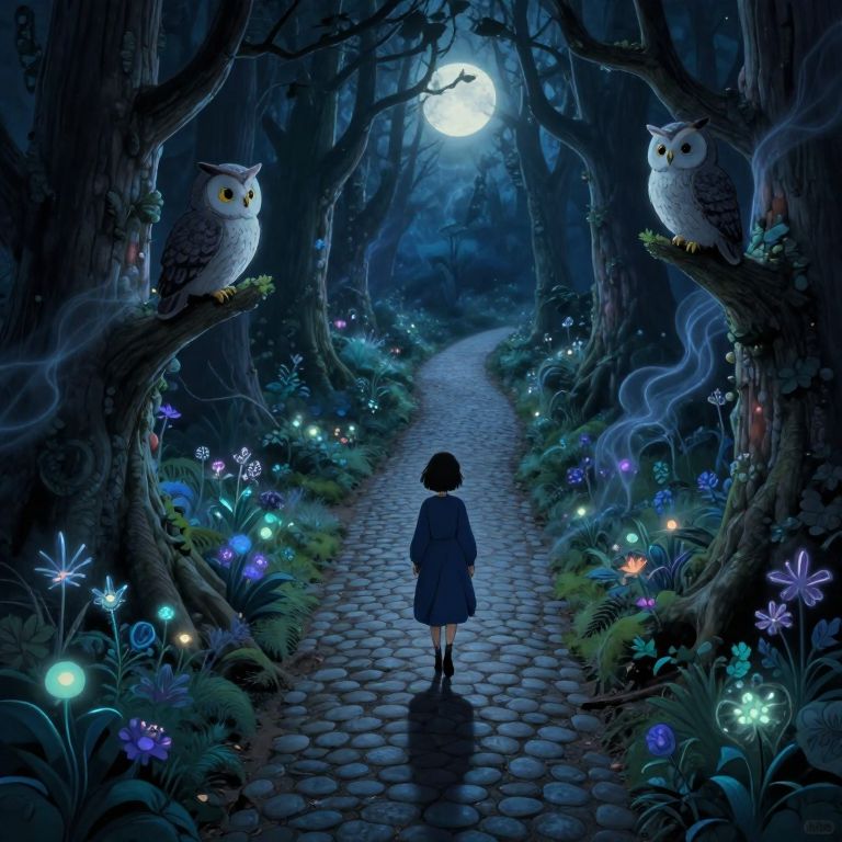 This digital illustration depicts a mystical, moonlit forest path. A young girl with short black hair, wearing a dark blue dress and black shoes, walks away from the viewer on a cobblestone path. The path is flanked by vibrant, glowing blue, purple, and green flowers, and tall, twisted trees. Two large, white owls with yellow eyes perch on branches above her, and wisps of ethereal blue smoke curl through the air. The full moon shines brightly in the background, casting a soft, blue luminescence over the scene. The overall atmosphere is enchanting and magical.