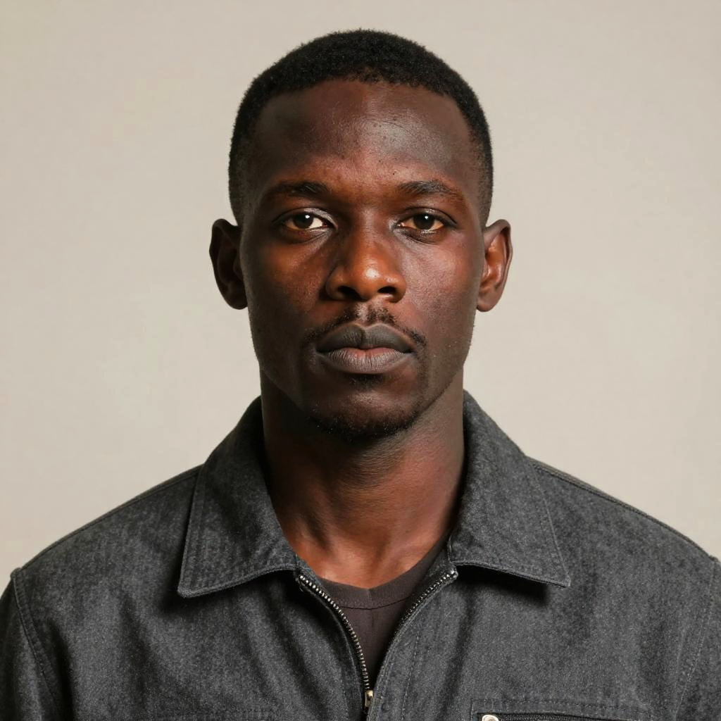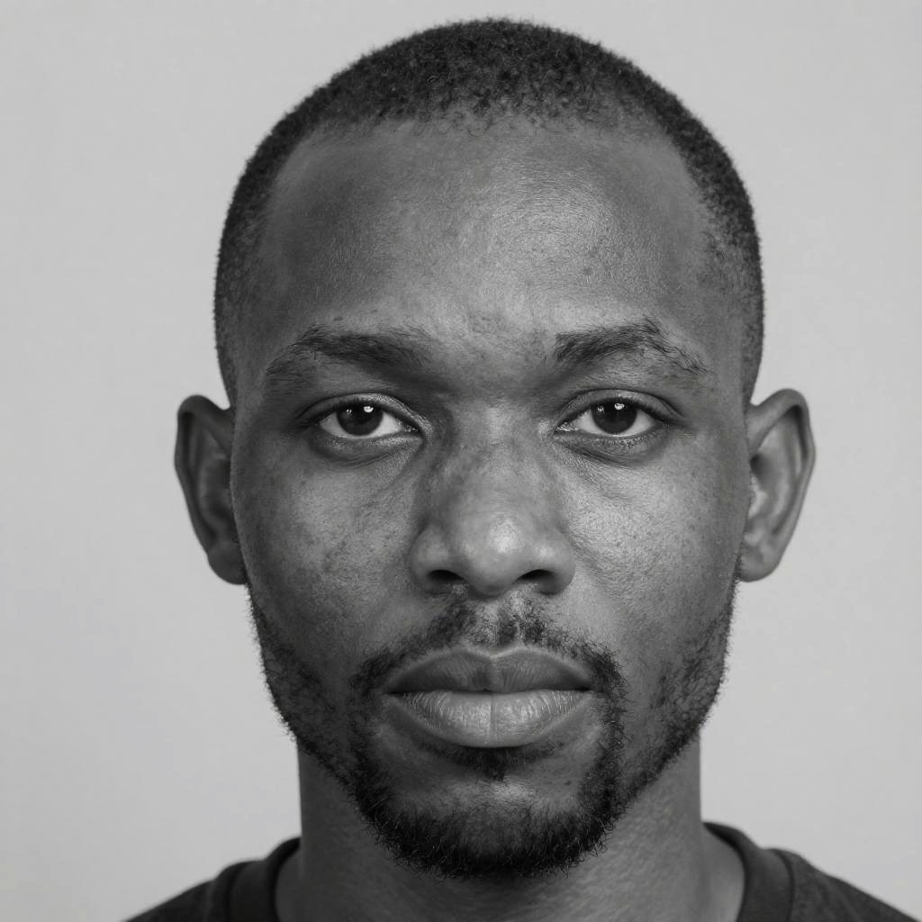 This is a high-contrast, black-and-white photograph of a young Black man with a close-cropped beard and short hair. He has a medium skin tone, dark eyes, and a neutral expression. His lips are slightly parted, and his eyebrows are slightly raised. He is wearing a dark shirt with a rounded neckline. The background is a plain, bright white, making his face the focal point. The texture of his skin and hair is clearly visible, highlighting the photograph's detailed and realistic style.