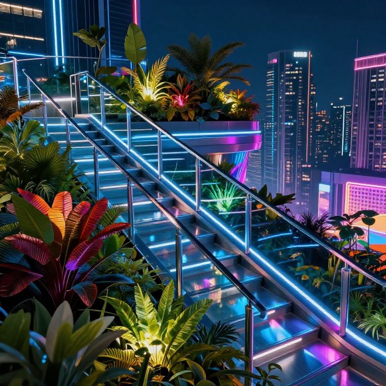 Rampe ascending a futuristic rooftop garden overlooking a neon cityscape at night, sleek glass and metal railings with embedded LED lights, vibrant lush plants along the edges, cyberpunk aesthetic, neon reflections, ultra-detailed environment.