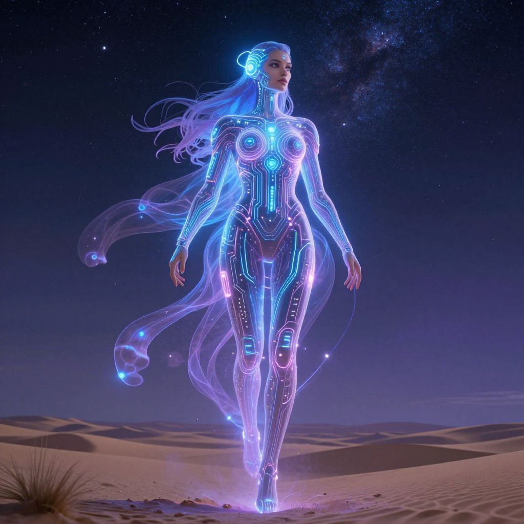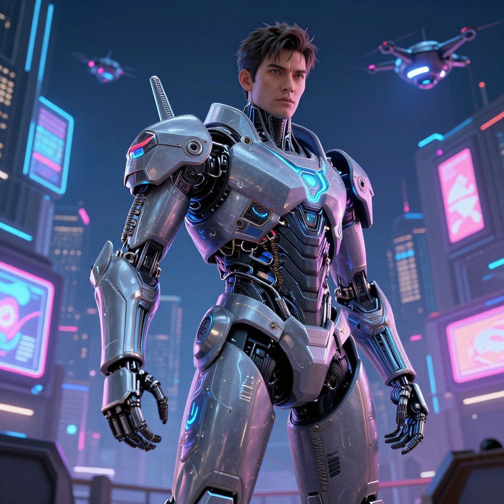Heb, futuristic cyber shaman with glowing tattoos and a robotic companion, glowing neon cityscape in the background, blending ancient spiritual symbols with high technology elements, vibrant synthwave palette of purples, pinks, and blues, highly detailed digital art.