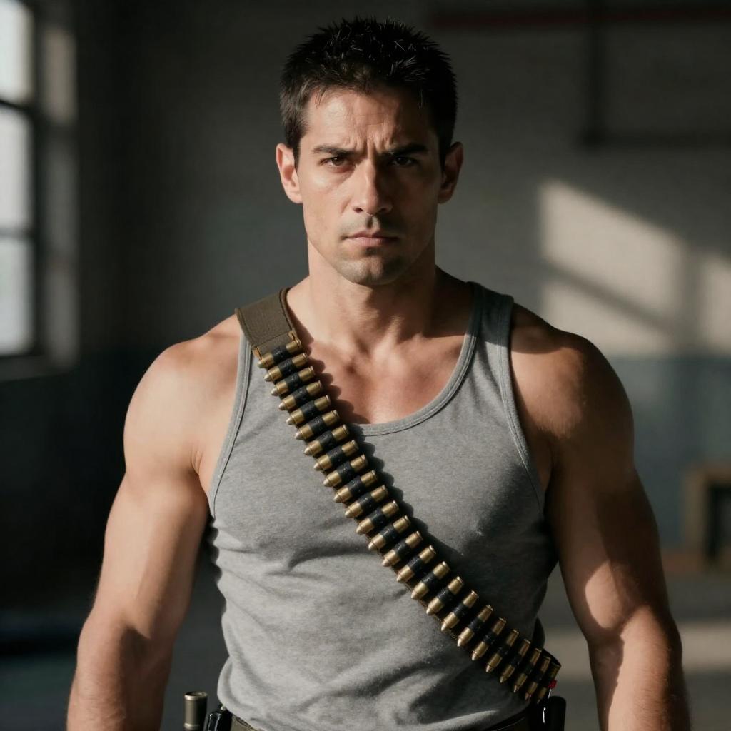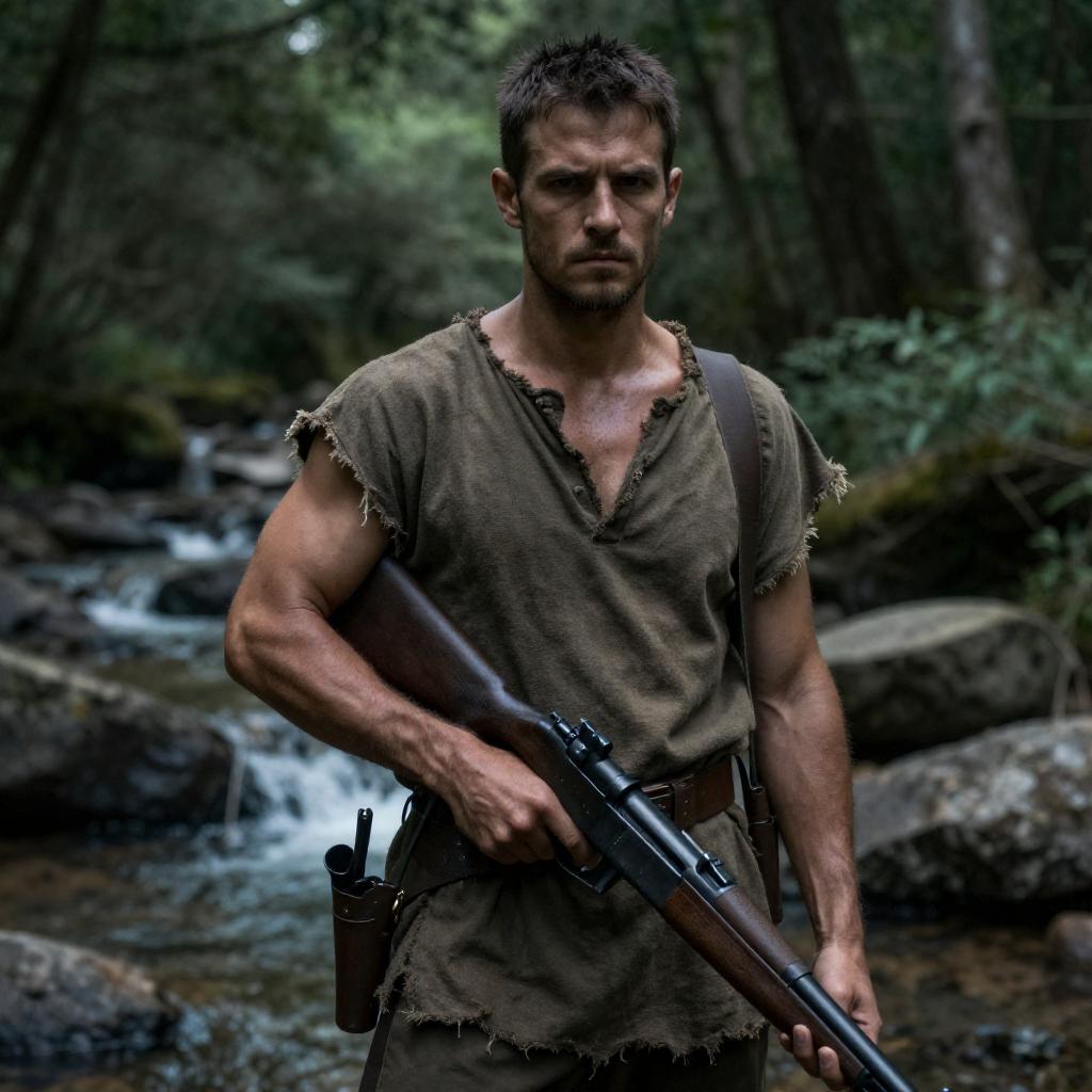 Photograph of a rugged, dark-haired man in a brown, tattered tunic standing in a rocky forest stream. He holds a black rifle with a determined expression, surrounded by dense green trees and white rocks. Bright sunlight filters through the trees, highlighting his muscular build and the ure of his clothing.