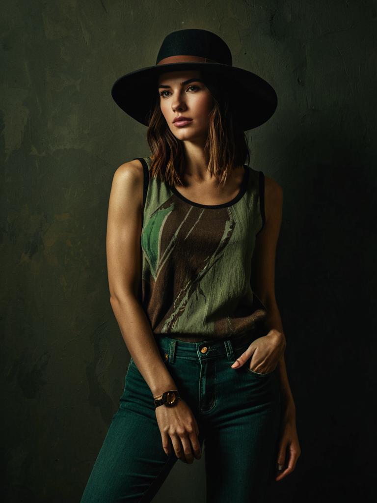Portrait of a young woman wearing a sleeveless green denim dress with front button closure, chest patch pockets, and a tied waist. She accessorizes with a taupe wide-brimmed felt hat and multi-colored bracelets. The background is dark with textured walls, highlighting her casual yet stylish outfit.