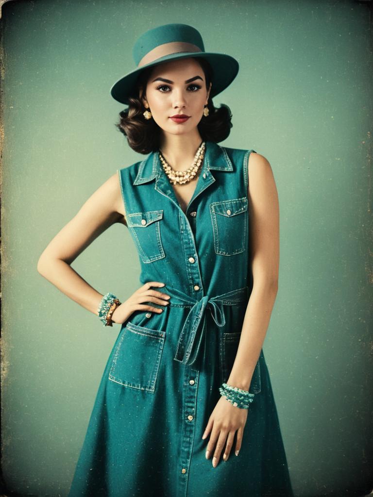 Woman, casual, sleeveless denim dress, knee-length, shirt collar, front button closure, chest patch pockets, tied waist, frayed hem, taupe wide-brimmed felt hat, multi-colored bracelet. --sref 1406