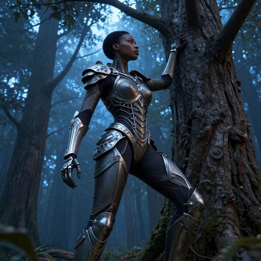 Photorealistic CGI image of a dark-skinned woman with long, white hair standing in a lush, tropical outdoor setting with overcast skies. She wears shiny, silver and gold armored clothing with intricate designs, including a high-collared cape with a black and white floral pattern. Her expression is serious, and she gazes slightly to the side. In the background, there are large green banana leaves and a blurred, futuristic, dome-shaped structure. The armor's reflective surface contrasts with the dark, moody sky and the vibrant greenery, creating a dramatic and epic atmosphere.