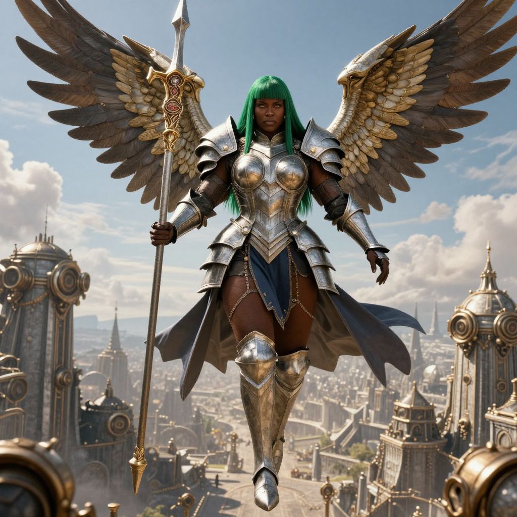 Photorealistic CGI of a strong Black woman with white hair, wearing shiny silver and gold armor, standing in a cloudy, tropical landscape with a distant