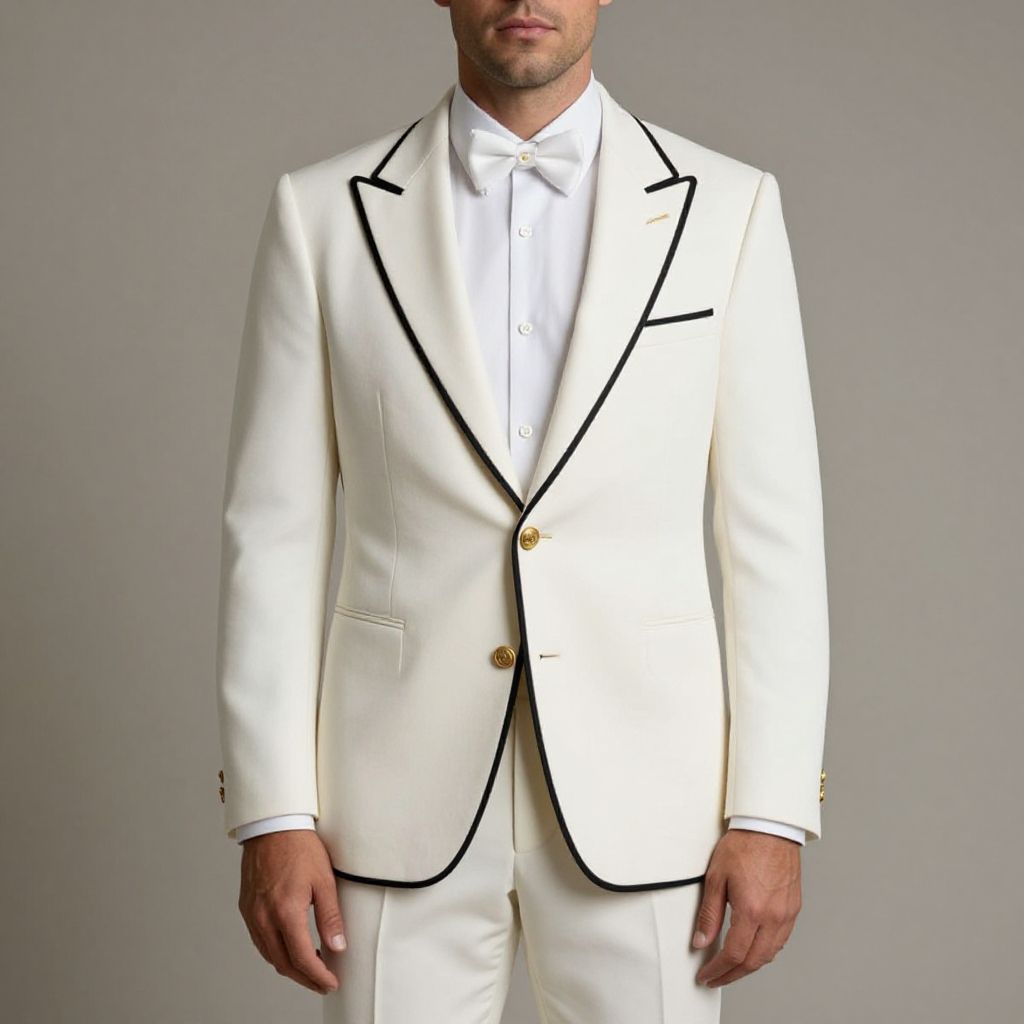 Photograph of a man from the waist up, wearing a white tuxedo with black trim and gold buttons. He has a white dress shirt and a white bow tie. The background is a solid, light gray. The man's face is partially visible, showing a trimmed beard and short hair. His hands rest by his sides, and the tuxedo's sleek fabric has a smooth texture. The overall style is formal and elegant, emphasizing the contrast between the white suit and black trim.