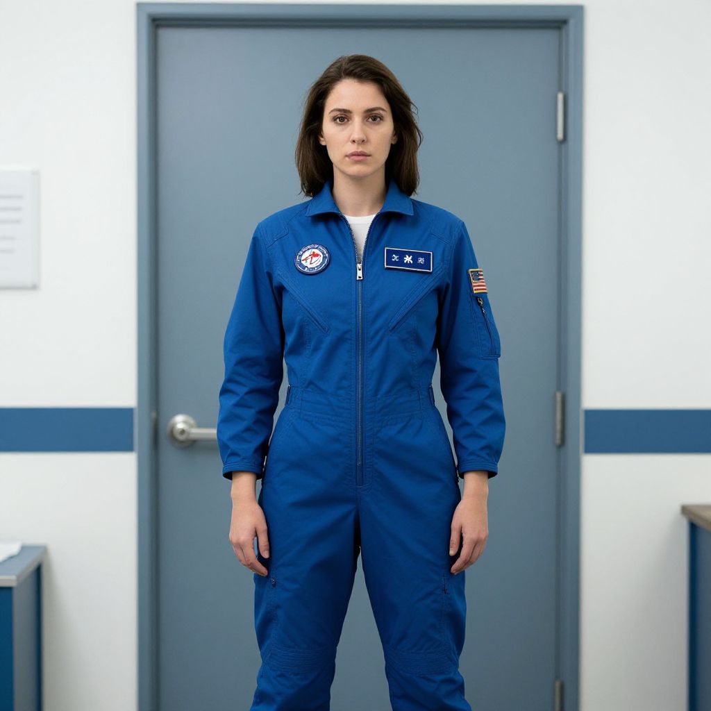 "Woman Flight Suit, a woman in a space suit standing in front of a door"