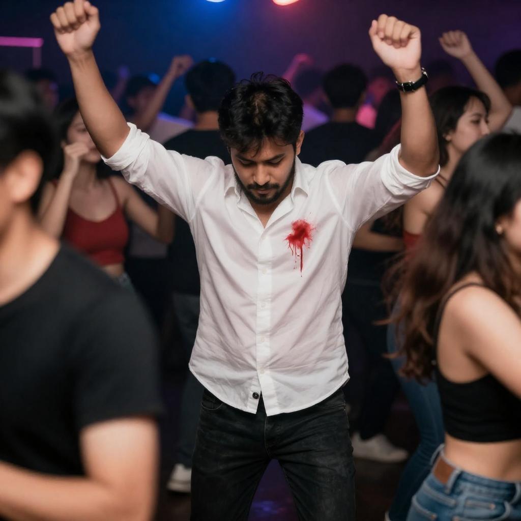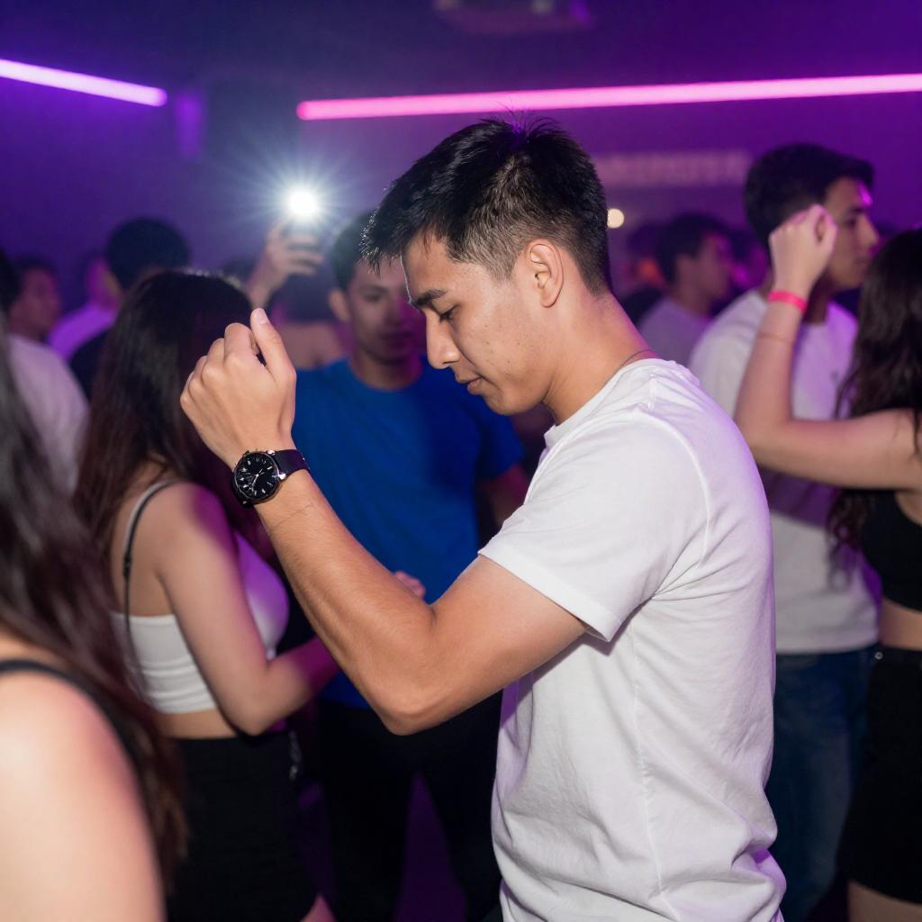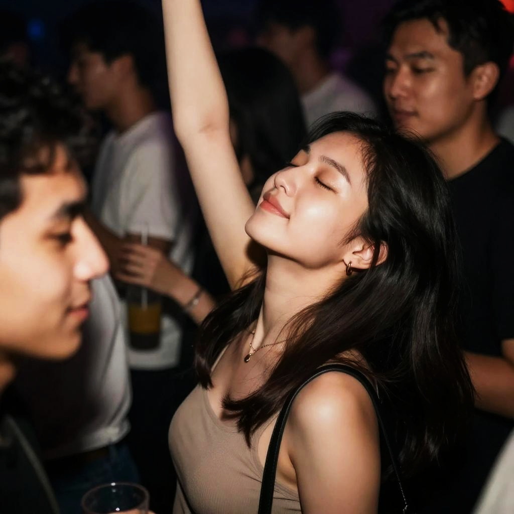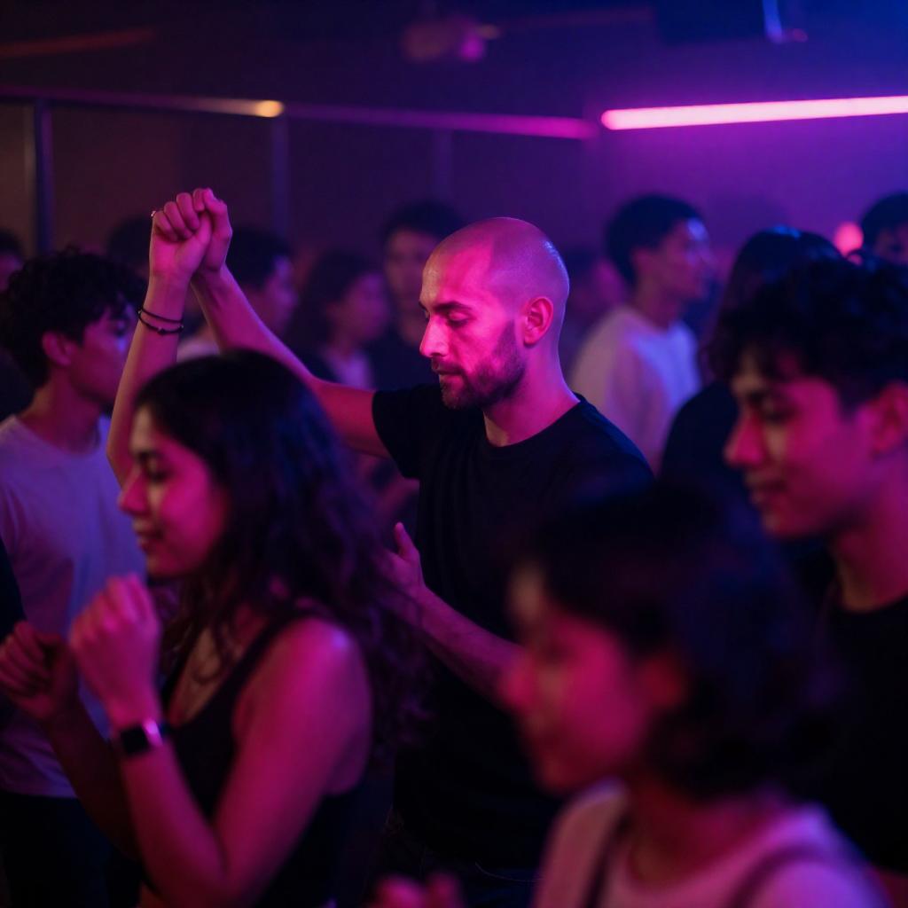 Photograph of a crowded nightclub with bright, flashing lights. A man with short black hair in a white shirt stands in the foreground, facing a woman with dark hair in a green top. Other people, mostly in dark clothing, surround them. A woman in a pink jacket holds a green beer can to her mouth on the right.