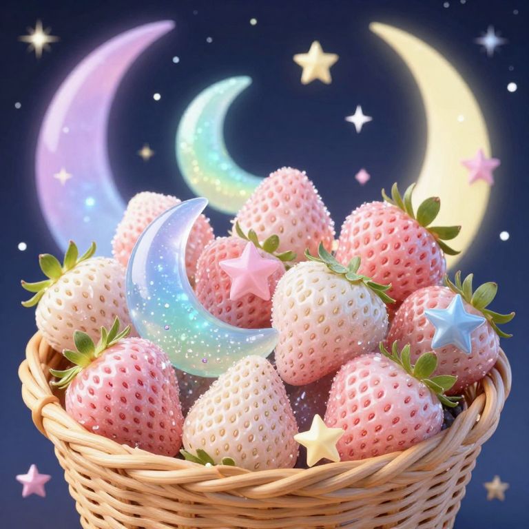 A basket filled with crystal strawberries, moons, and stars, featuring rainbow pastel colors and a moons and stars background.