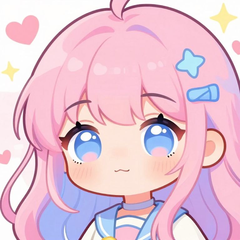 Pout face anime character, vibrant pastel colors, large expressive eyes, soft shading, cute chibi style, slight blush on cheeks, detailed hair strands, whimsical background with floating hearts and stars, playful and innocent mood, high resolution.