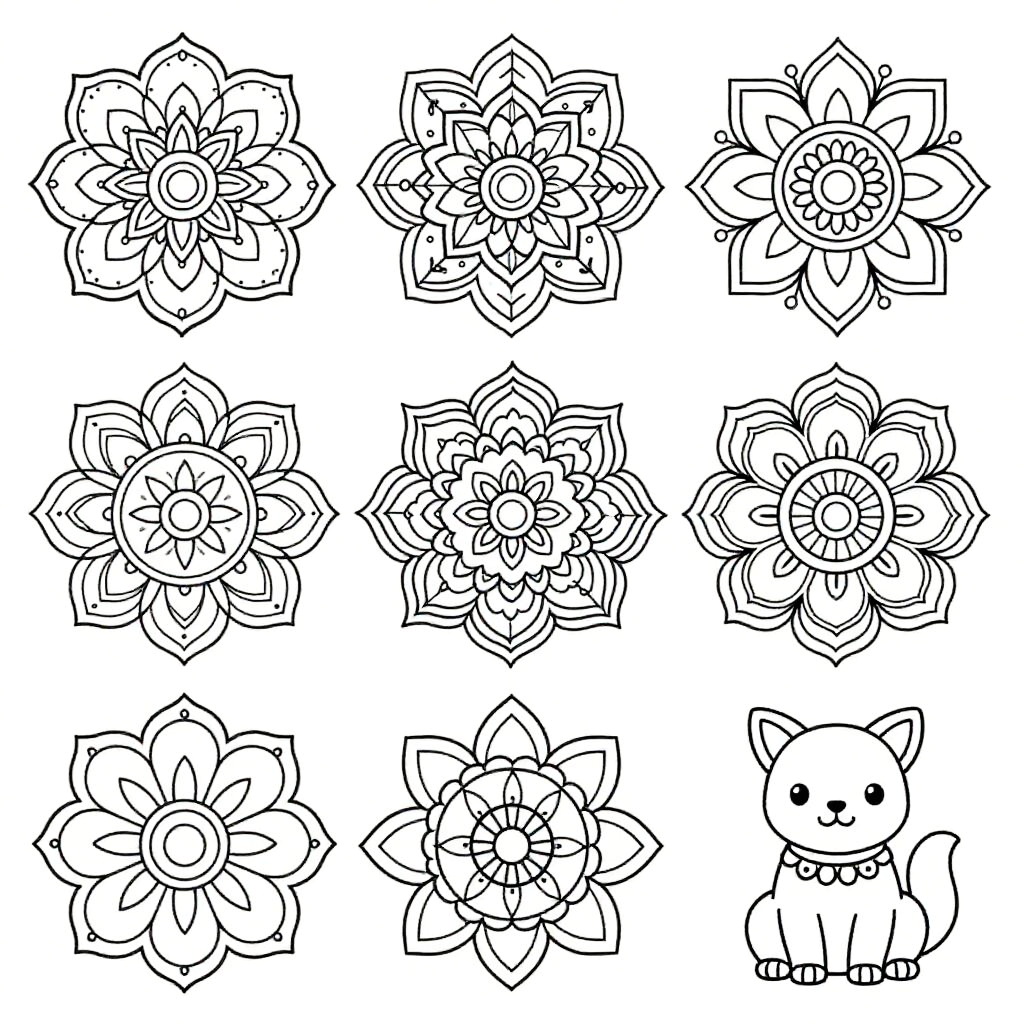 AI coloring pages featuring intricate mandala designs, delicate floral patterns, and playful animals, all rendered with clean lines and easy-to-color spaces, designed for both children and adults to enjoy a creative and relaxing coloring experience.
