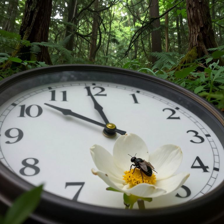 Photograph of a large clock with black numbers and hands, set in a lush forest. A black beetle sits on a white flower at the clock's