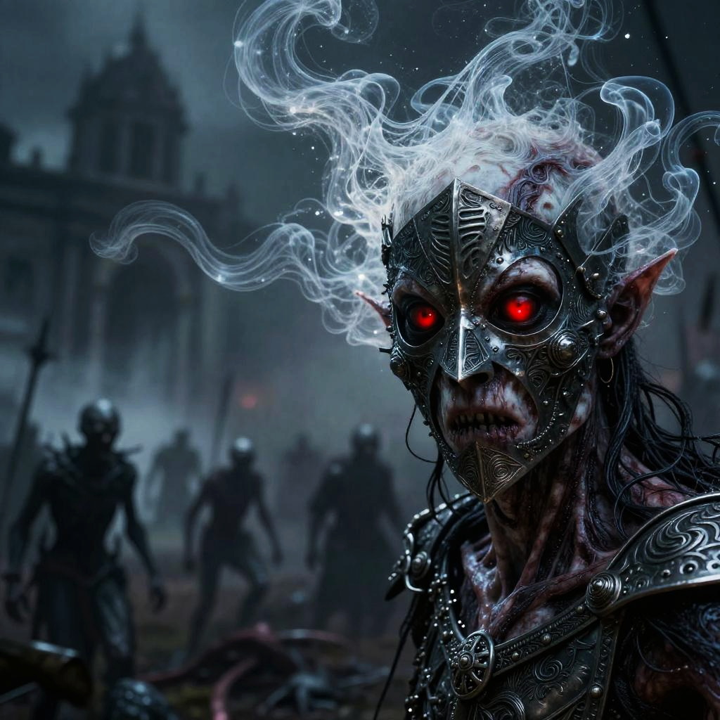This is a digital artwork depicting a dark, eerie scene. The foreground features a demonic figure with glowing red eyes, twisted black skin, and a grotesque, snarling face. The figure wears an ornate, metallic mask with swirling white smoke emanating from its head. The background is blurred, showing a foggy, gothic cityscape with silhouetted figures wielding swords. The overall color palette is dark and moody, with shades of black, blue, and red dominating the scene. The demonic figure's menacing presence contrasts sharply with the mystical, smoky elements, creating a chilling, otherworldly atmosphere.