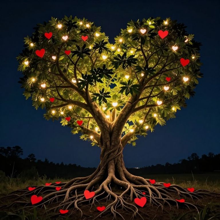 A heart-shaped tree stands as a beacon of eternal love, its radiant glow illuminating the night sky, while roots entwined with scattered red hearts weave a tapestry of connection, transcending time and space with a profound sense of serenity and hope.