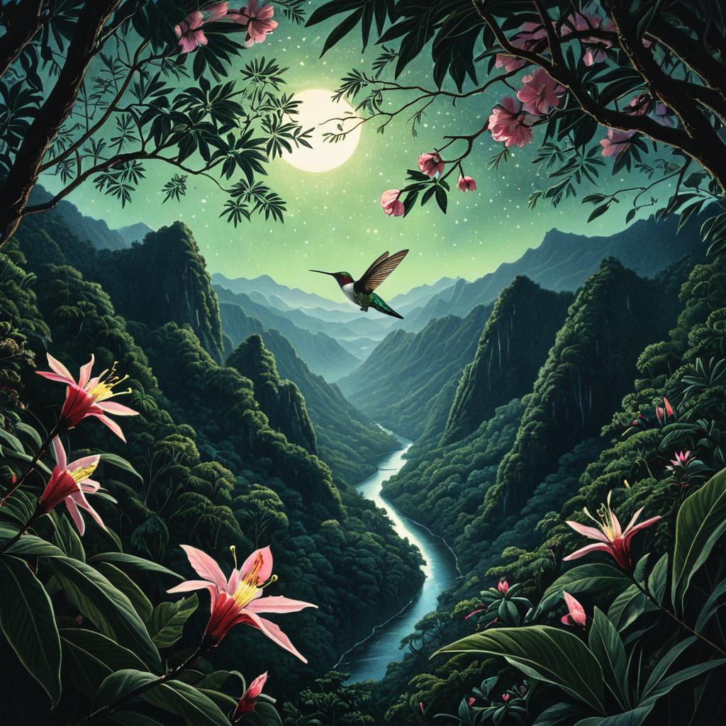 A peaceful river flowing through a dense jungle, featuring exotic birds soaring above the lush canopy, painted in vivid surrealism, evoking a feeling of calm adventure