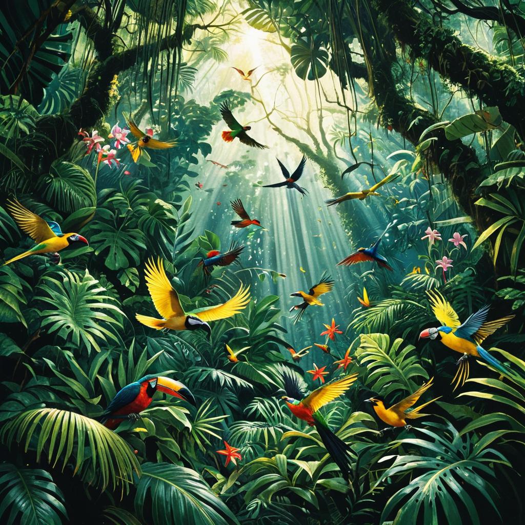 A vivid surrealistic painting of a peaceful river flowing through a dense, lush jungle. The scene features vibrant exotic birds soaring above the thick green canopy, surrounded by tropical plants and trees. The image evokes a calm yet adventurous atmosphere within a thriving natural rainforest environment.