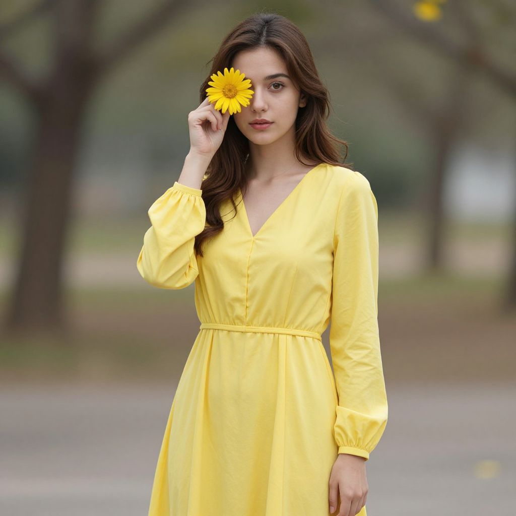 Photograph of a young woman with long, wavy dark brown hair, wearing a loose-fitting, long-sleeved yellow dress with a V-neck. She holds a bright yellow daisy up to her right eye, partially covering her gaze. Her expression is neutral, with slightly parted lips. The background is a blurred outdoor setting with greenery and tree trunks, suggesting a park or garden. The bright yellow of her dress and daisy contrasts with the muted greens and browns of the background. The lighting is natural, enhancing the vividness of her outfit and the flower.