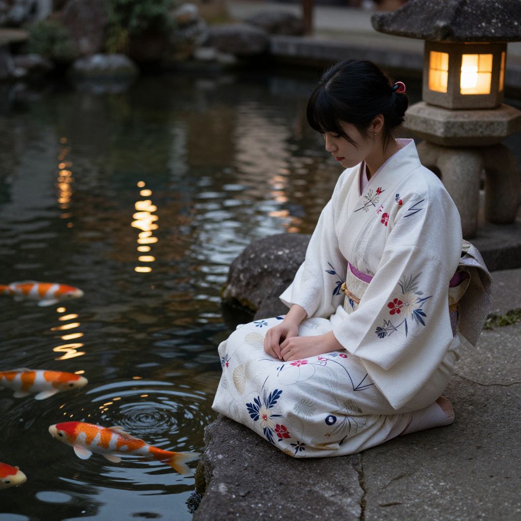 Photograph of an Asian woman with dark hair in a traditional white kimono adorned with red and blue floral patterns, kneeling beside a tranquil pond. She gazes downward with a contemplative expression. The pond features three orange and white koi fish, one of which is near the water's edge. A stone lantern with a warm glow sits to the right, and the background includes blurred rock formations and greenery. The scene exudes a serene, traditional Japanese garden atmosphere.