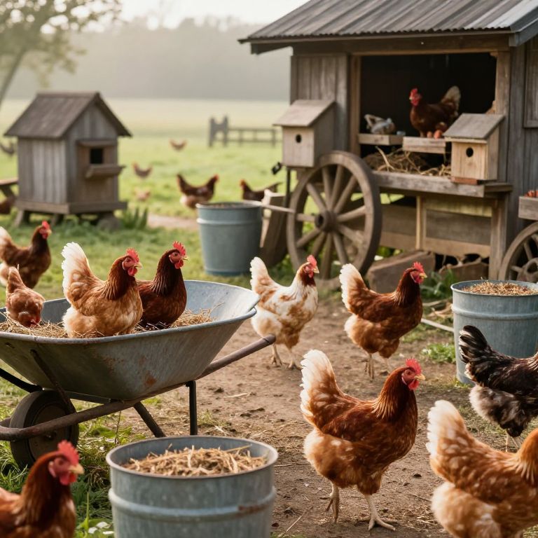Henyard bustling with hens of various breeds, some sitting on nest boxes, others wandering around clucking, old wooden wheelbarrow and feed buckets around, early morning light casting soft glow, cinematic wide shot with vibrant colors and rustic charm.