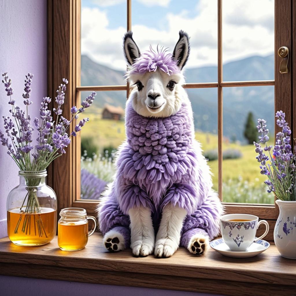 A whimsical, cute, fluffy lavender cartoon llama sitting on a windowsill with a cup of lavender honey tea and a vase of baby's breath nearby, joyful smile, relaxed vibe, 3D fantasy drawing style, cozy indoor setting, high quality and detail