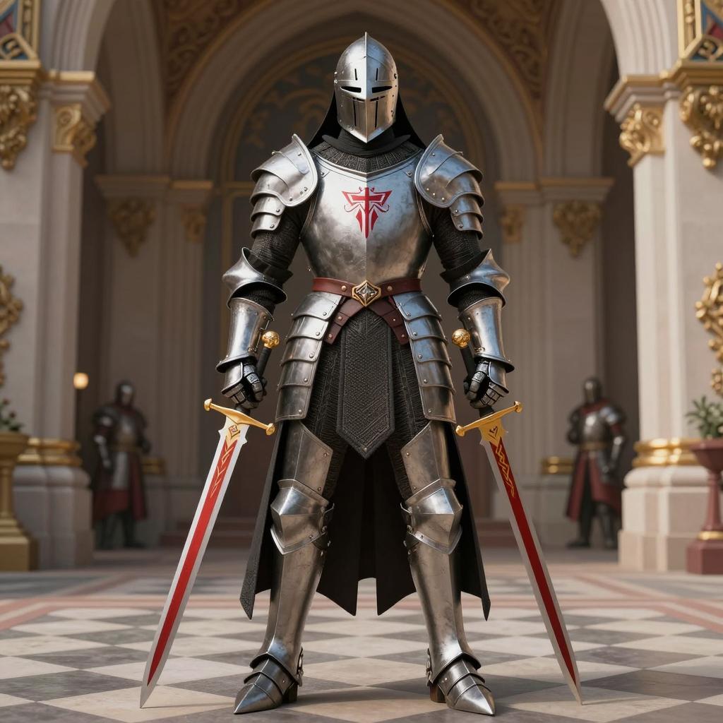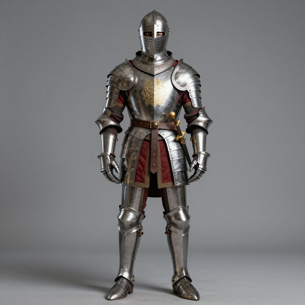 Shining armor costume, photorealistic medieval knight, standing, full body, front view, metal armor, detailed plate armor, brown leather belt with sword sheath, red tunic underneath, silver helmet with visor, serious expression, neutral background, studio lighting, realistic ures, steel armor with gold highlights, knee-length boots, hands in front, centered, realistic CGI, fantasy armor, detailed metalwork, slight shadow on floor