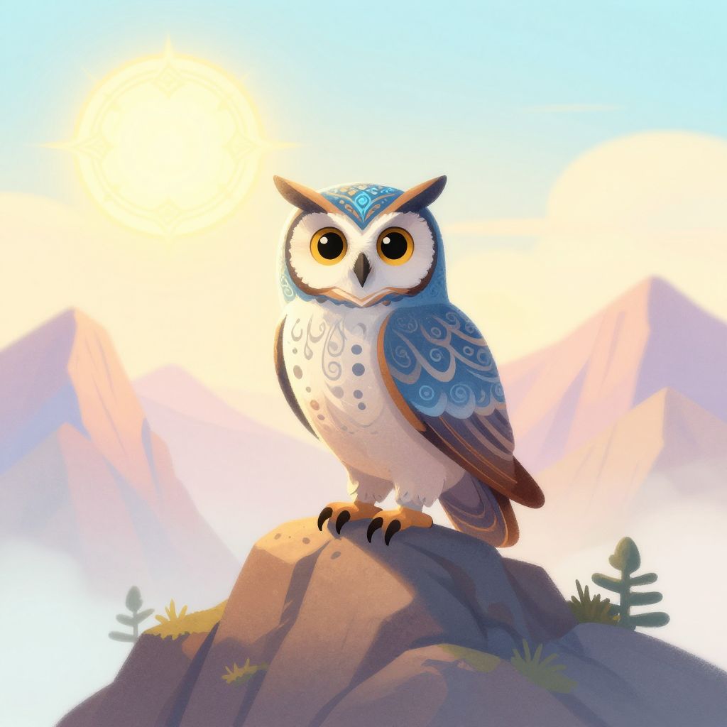 A fantasy illustration of a wise owl mage perched on a rocky mountain peak. The owl features intricate blue and brown feathers with magical patterns, set against a backdrop of sunlit pastel-colored mountains and a glowing, ornate sun. The scene combines elements of mysticism and nature in soft pastel tones.