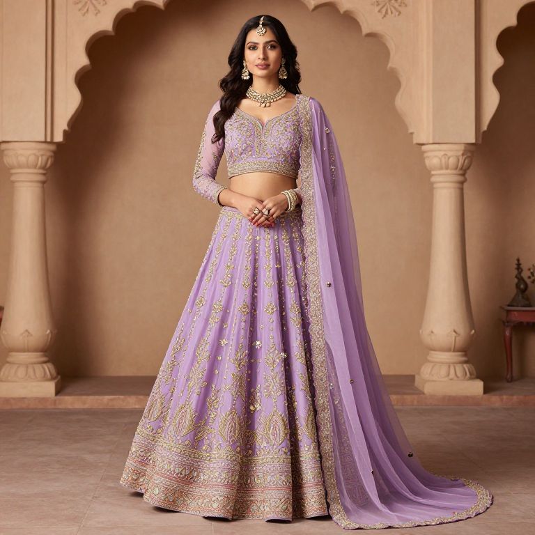 Photograph of a South Asian woman standing in an ornate, beige archway. She has long, black, wavy hair adorned with a gold headpiece. She wears a lavender, long-sleeved, crop top and a full, flowing lehenga with intricate gold embroidery and a matching dupatta (scarf). Her jewelry includes a statement necklace, earrings, and a bangle on her right wrist. Her complexion is medium brown. The background features carved stone columns and a polished stone floor. The lighting is warm, highlighting the rich textures and colors of her traditional attire.