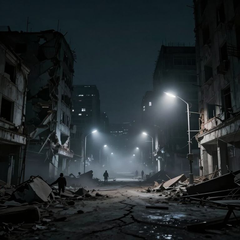 Destroyed cityscape at night, flickering streetlights among collapsed structures, mist rolling over cracked streets, faint silhouettes of survivors, cinematic and moody dystopian environment.