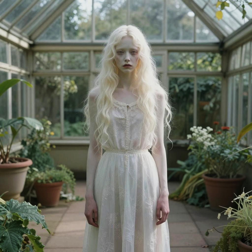 In a sunlit overgrown conservatory, she stands alone, a melancholic ghost drifting through a harsh reality. Her stunning yet porcelain melancholy is a testament to a heart hardened by suffering, inspired by the works of Mark Brooks and Gerda Wegener.
