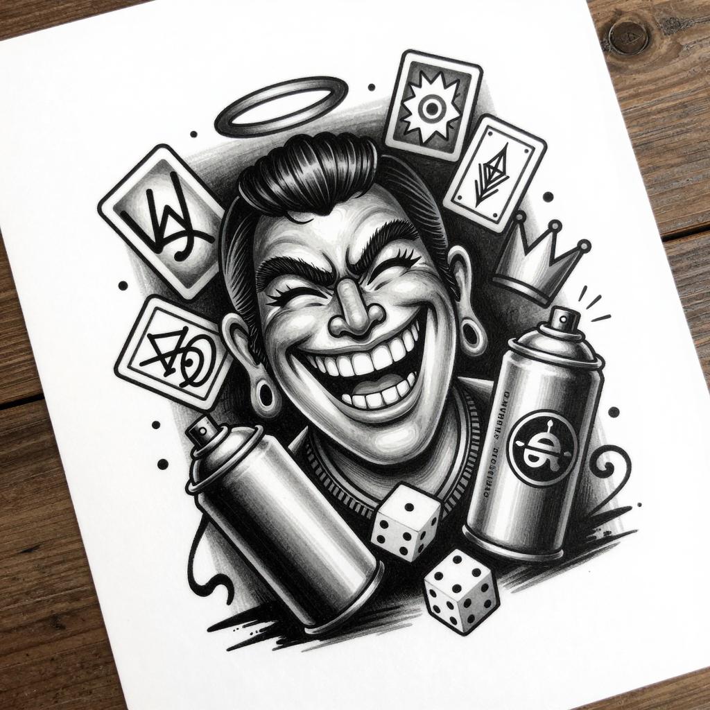 Black-and-grey Chicano art drawing featuring a grinning character with sharp eyeliner and an exaggerated mouth, surrounded by spray paint cans, playing cards, and dice in mid-air. The illustration includes symbolic elements such as halos and crowns, rendered with strong foreshortening and dynamic tilted composition, showcasing a detailed tattoo style.