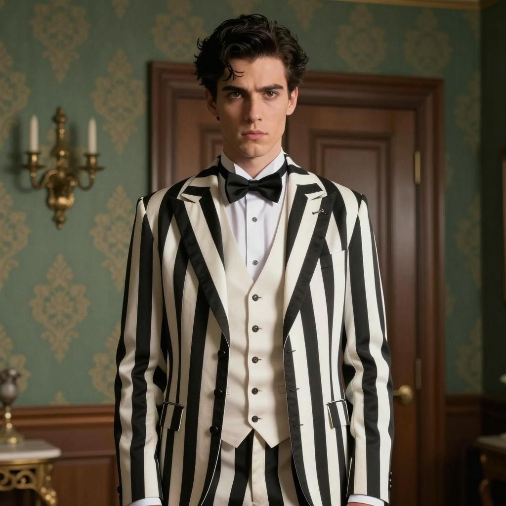 Gomez addams outfit costume, photograph of handsome young man, black hair, wearing black and white striped suit, white vest, black bowtie, standing in ornate room, green patterned wallpaper, wooden door in background, candle wall sconce, vintage style, formal attire, serious expression, medium shot, realistic, high detail, warm lighting