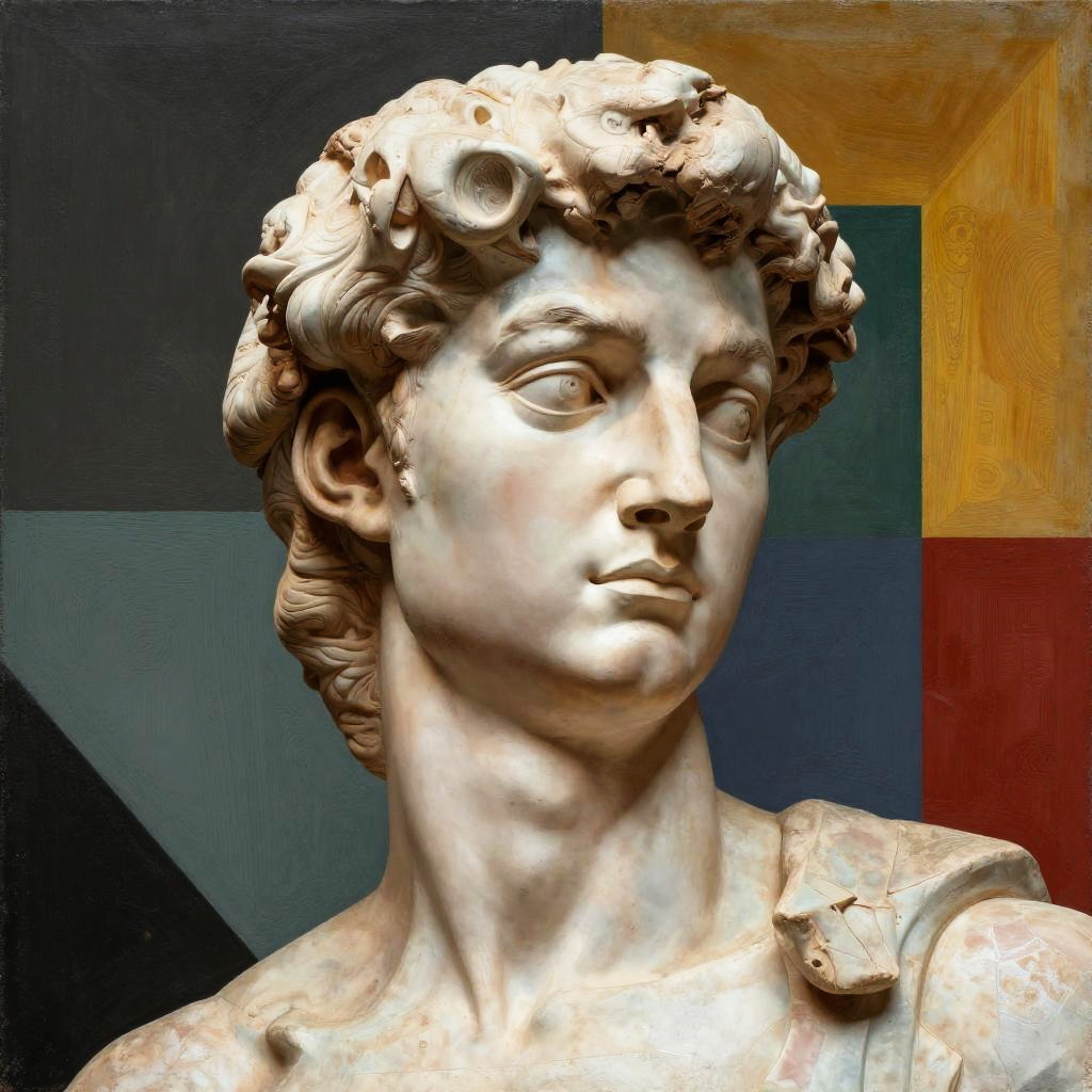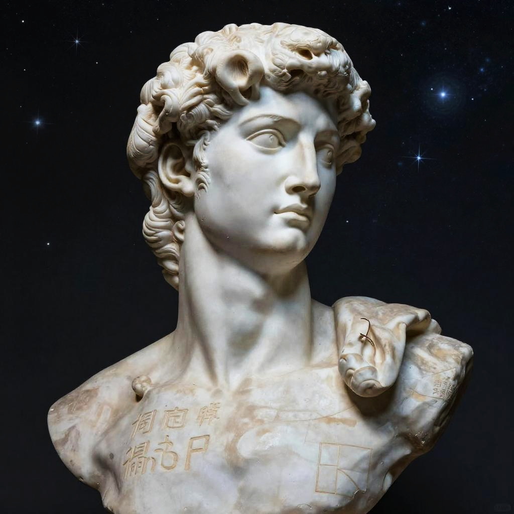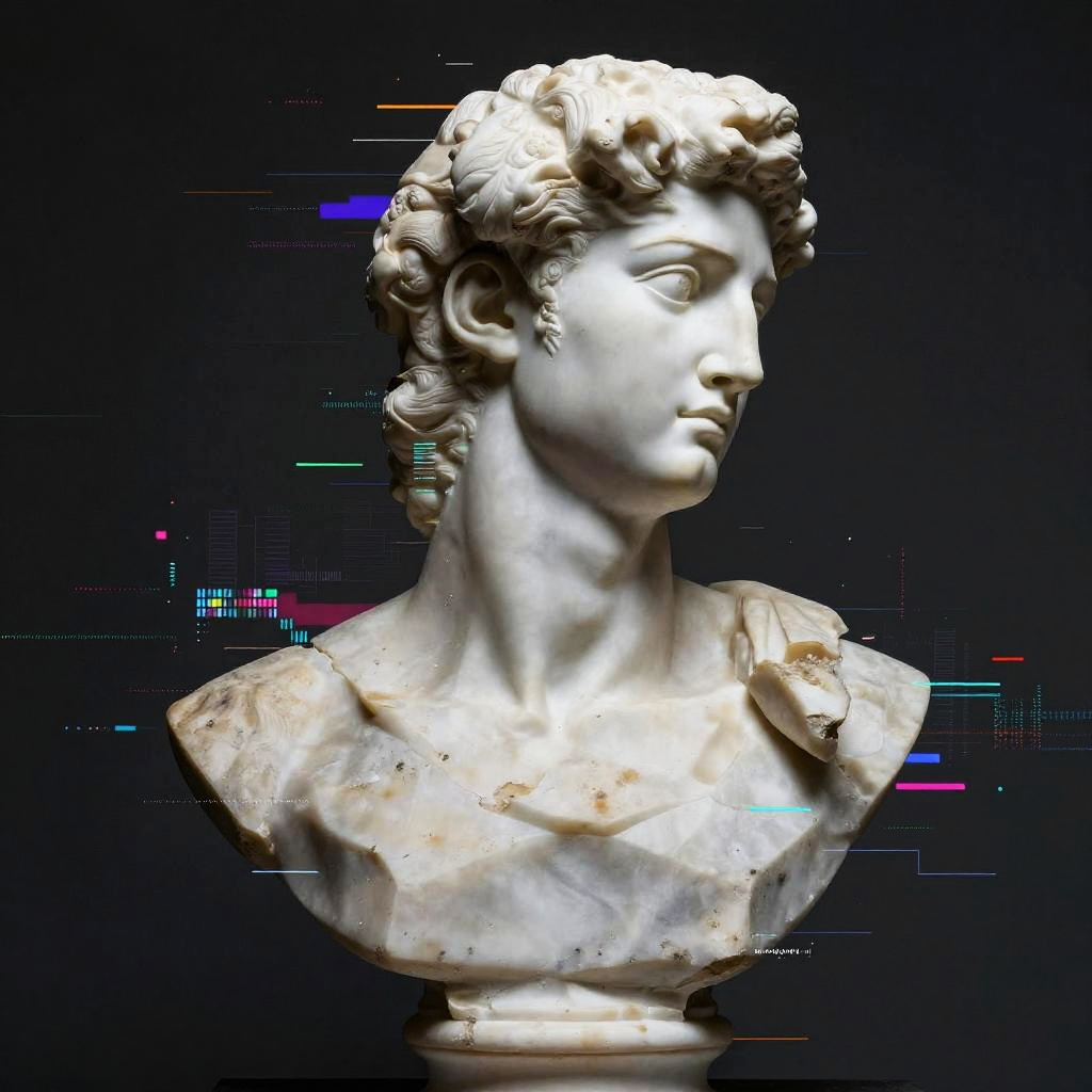 Photograph of a classical marble statue with a serene face, adorned with blue and gold translucent ribbons, and a small firework in the background.