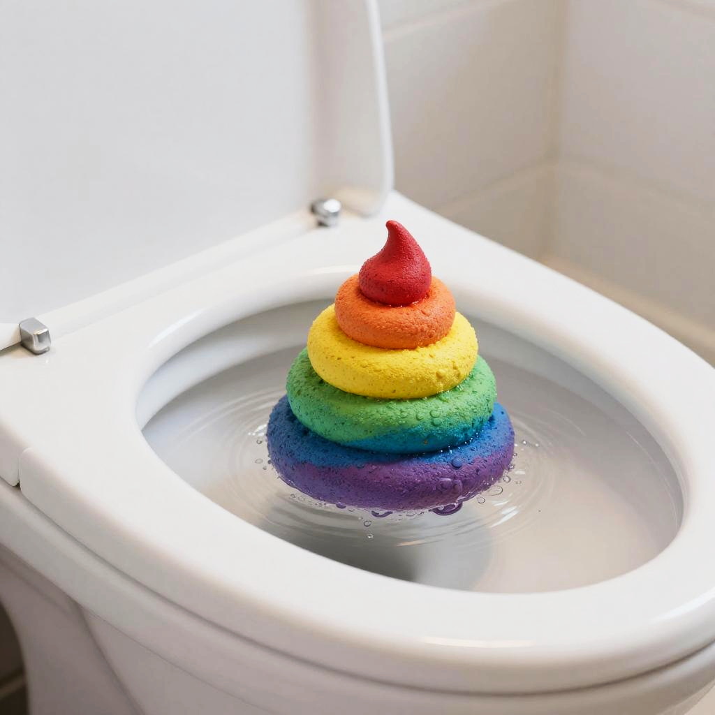 Close-up of rainbow poop in toilet, colorful segments blending together, realistic water ripples, clean modern bathroom background, vivid and surreal image