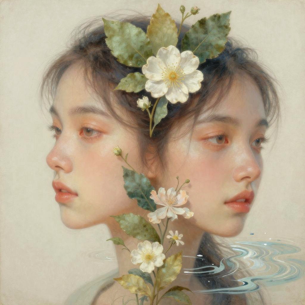 Image blender AI rendering a fusion of human faces with nature elements, leaves, flowers, and water merging smoothly, creating a harmonious, ethereal portrait with soft pastel tones and intricate textures, ultra-realistic digital painting.