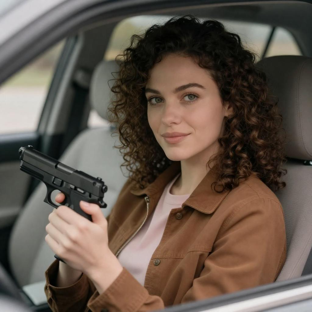 Young woman with long brown hair, intense gaze, wearing yellow shirt, peeks from behind door, aiming silver handgun at camera. Blurred bald man in foreground. Green wall on right, wooden door frame on left. Dimly lit room.