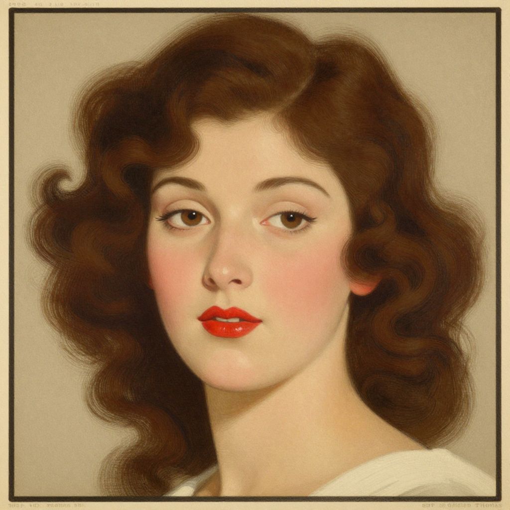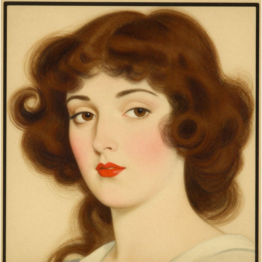 Vintage-style digital portrait of a fair-skinned woman with wavy brown hair, red lipstick, and soft pink cheeks, against a beige background.