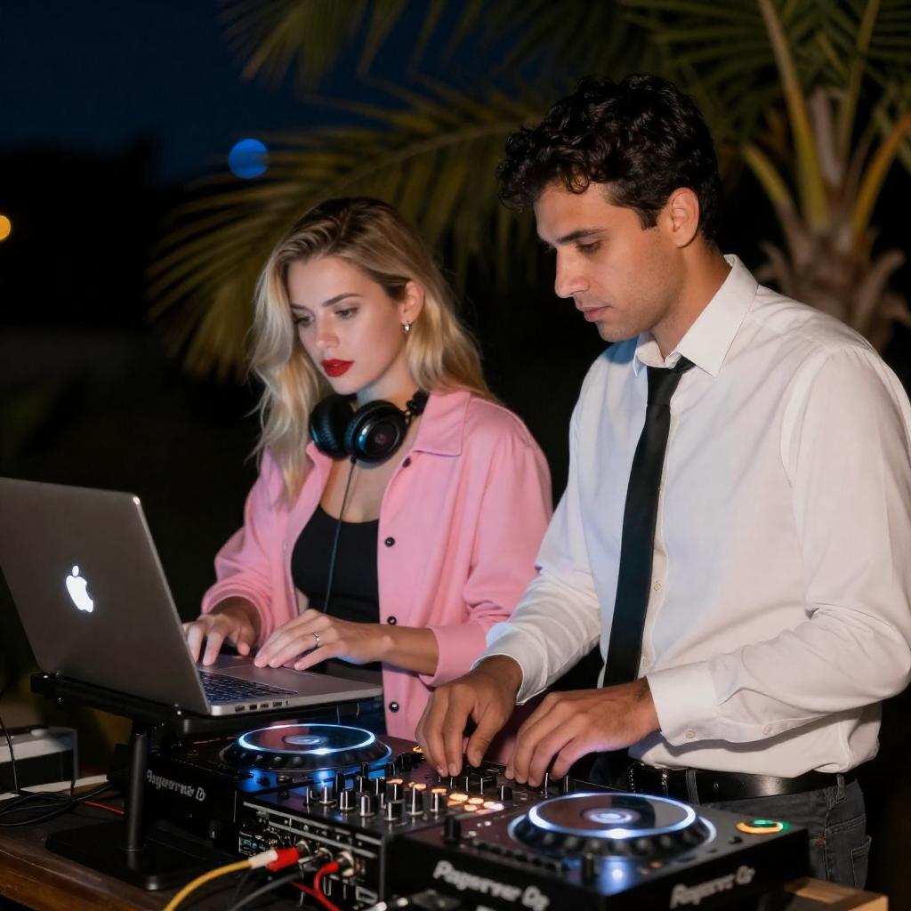 Photograph of a nighttime DJ setup. A blonde woman with red lipstick and a pink jacket operates a laptop with an illuminated Apple , while a dark-haired man in a white shirt and black tie adjusts a DJ mixer. Palm fronds are visible in the background, illuminated by blue and yellow lights.