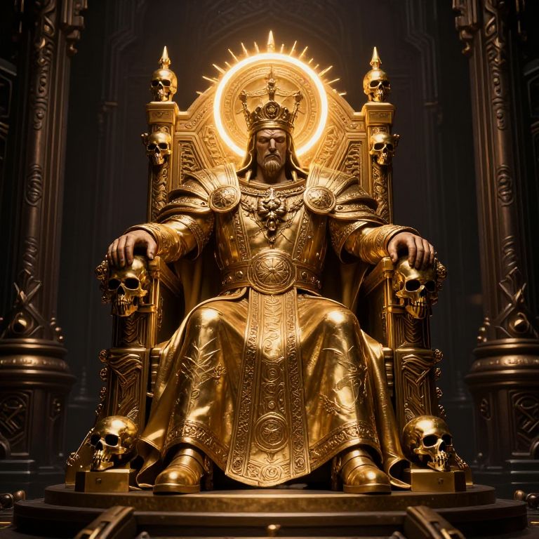 Warhammer 40k Emperor golden throne, colossal throne adorned with gold filigree and skull motifs, Emperor pictured in regal pose with glowing halo, blending mysticism and advanced technology, dark gothic sci-fi environment with intricate mechanical details
