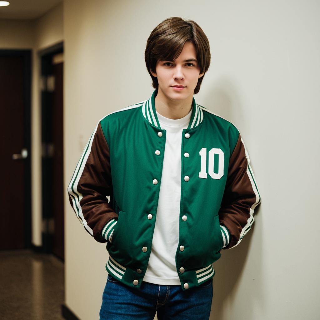 Ben Tennyson, cosplay costume green varsity jacket with white stripes, black shirt with number 10, blue jeans, casual shoes, short brown hair, soft lighting, depth of field