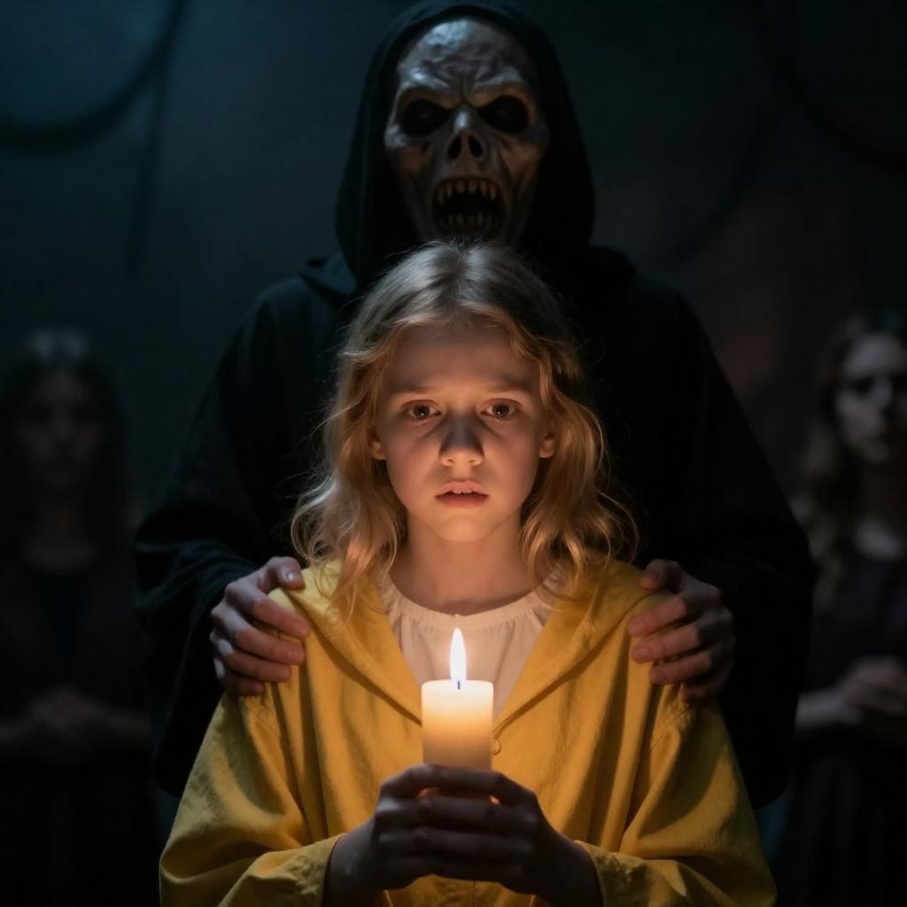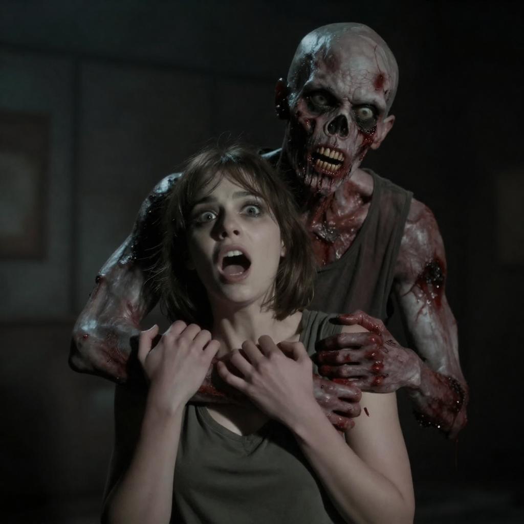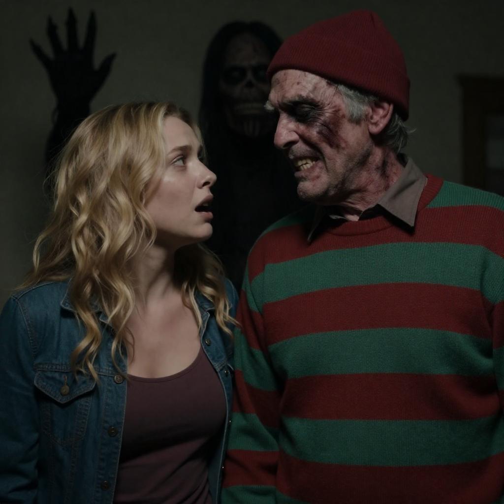 Photograph of a horror scene. A large, menacing man with a striped shirt, hat, and grotesque face stands behind a frightened woman with blonde hair and a white shirt. His clawed hand reaches towards her. Red lighting.
