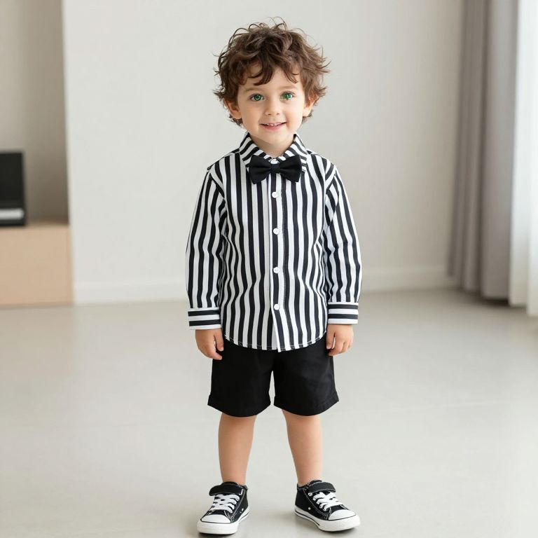 A young boy wearing a stylish black and white striped shirt with a neat bow tie, paired with black sneakers, standing confidently in a modern, well-lit room with soft background lighting. The boy has messy, slightly tousled brown hair, bright green eyes, and a cheerful expression, adding a sense of playfulness and innocence to the scene. The outfit is clean and well-fitted, highlighting his youthful energy and attention to detail.