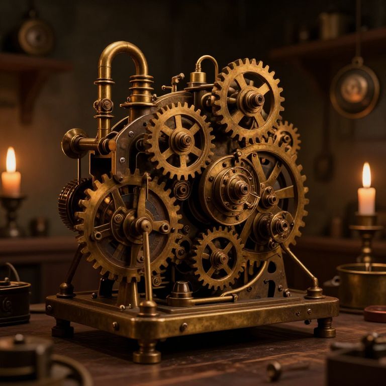 Easy:zkqycgztpoi= displayed as an ornate steampunk mechanical device with rotating gears and brass pipes, set inside an old workshop illuminated by warm candlelight, highly detailed textures, vintage atmosphere, realistic rendering