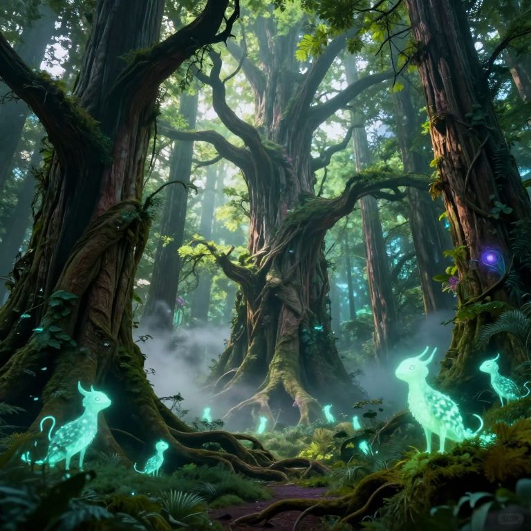 Fantastical forest scene with glowing, ethereal deer-like creatures, surrounded by towering, moss-covered trees and mist, illuminated by magical light. Digital